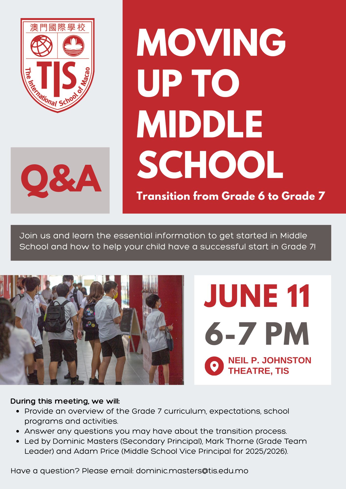 This Meeting will be lead by Secondary Principal Mr. Masters, Mr. Thorne (Grade team leader) and Mr. Price (Middle School Vice Principal for 2025-2026).